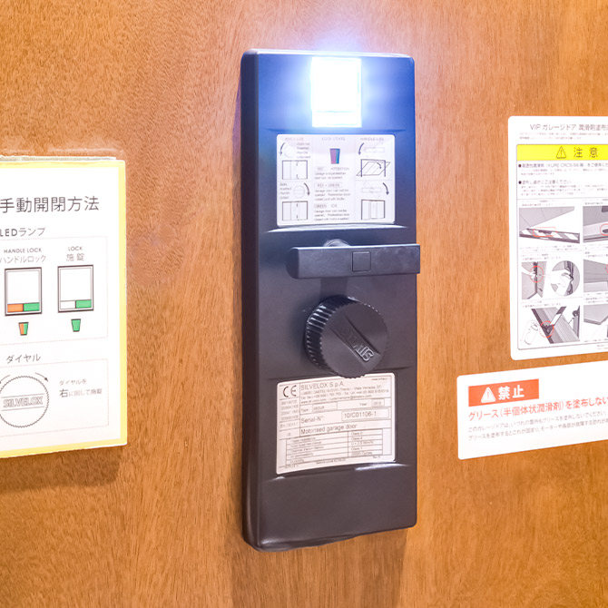内側のノブでセンタードアの開閉ができます。ドアが閉まったらランプが光るので、ガレージ内が暗くなっても安心して歩行することができます。