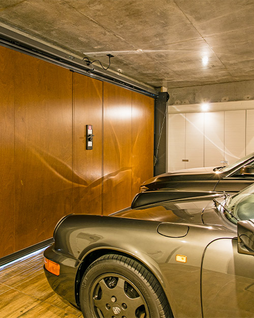 ドア厚が通常の倍の80㎜あるため、強風等によるゆがみや反そりが生じにくく、頼りになるガレージドアです。 機密性が高いので、ホコリで愛車が汚れる心配も、デリケートなクラシックカーへの心配も不要です。また、木製ガレージドアは音や振動を吸収するのでガレージ内で作業していても外に音が響きません。