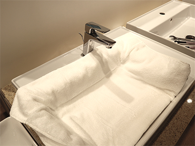 ネジ等の小さな部品が排水口に落ちないように、洗面ボウルの排水口を布や新聞紙などで覆ってください。