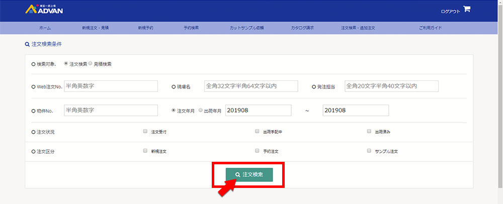 3.注文検索ボタンをクリックすると履歴が表示されます。注文数が多い場合は検索条件から注文を絞ると見つけやすくなります。