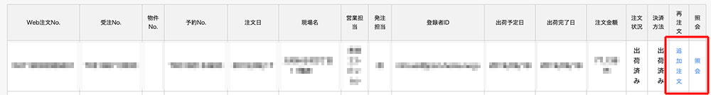 表の右の方に「再注文」と「照会」があります。再注文をクリックすると前回の注文内容で注文ページへ移動します。