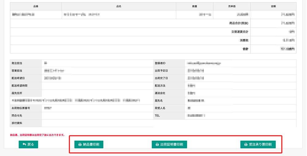 4.「照会」をクリックすると注文の詳細ページへ移動します。こちらでは納品書、出荷証明書、受注承り票がダウンロード・印刷する。