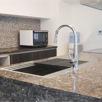 手をかざすだけで吐水してくれる自動水栓。かざした時にだけ吐水するので無駄な水は出ません。