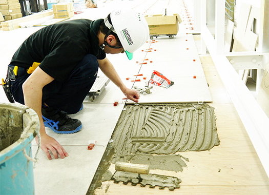 商業施設、店舗、住宅、駅など様々な場所でタイル・石材の施工をしています。