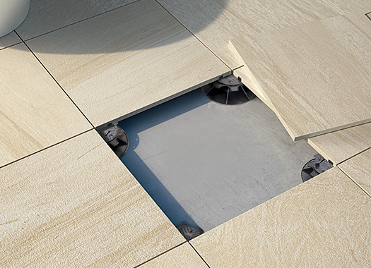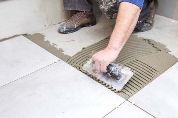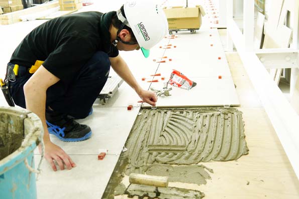 クリップで、大判のタイルや石材の段差をなくして平滑に美しく仕上げる工法。