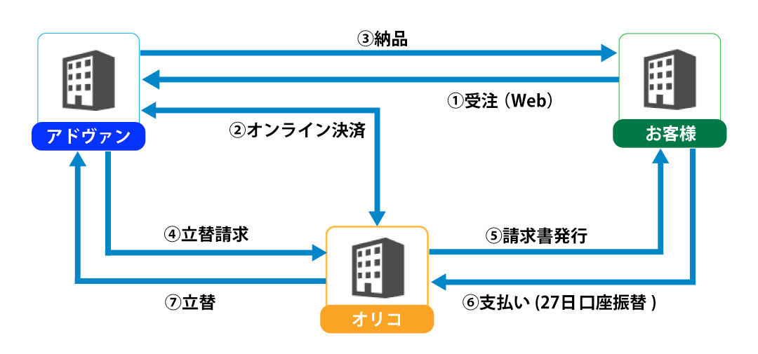 株式会社オリエントコーポレーションと連携し、三社間契約によってオリコの代金決済システム「B2B決済サービス」を利用できます。
