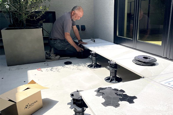 20mm厚タイルなら、マルチフット工法での施工が可能です。テラスやベランダにも簡単に施工ができるようになりました。 樹脂製なので錆びや腐食の心配もなく、安心して末永くご利用いただけます。 無段階調整式によるスピーディーな設置と、確実なレベル調整をお約束。目地から流れ落ちる雨水はすばやくマルチフットの間を流れ、ドライな床面を実現します。