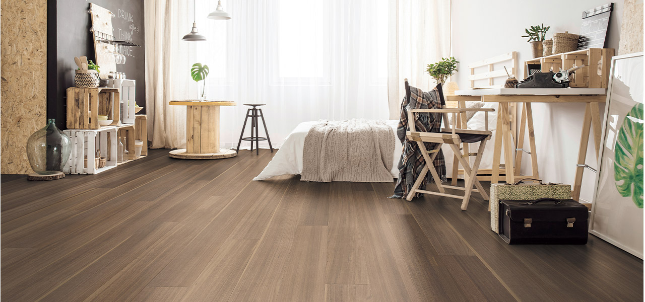 燻蒸成分が木のタンニンと結びつくことで、フローリング表層の色を変化させます。そのため、天然の色幅を残した自然な仕上がりになり、塗装のように剥がれ落ちる心配がありません。1 工程を 24 ~ 48 時間かけて行い最大 7 回繰り返すことで、重歩行の場所でも耐えられる優れた耐久性をもたらしています。