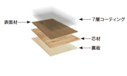 プレミアムオークは3層構造になっており、厚く丈夫で美しい表面材、耐久性に優れた芯材、フローリングを安定させる裏板で構成されています。表面にUVラッカーを最大7層塗布することで保護、他にない高品質なフローリングを生み出しています。