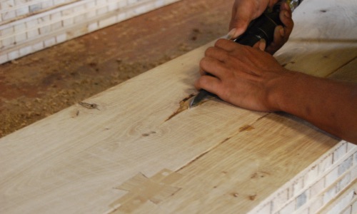 熟練の職人がブラシ、ナイフを使用し、丁寧に仕上げをすることで天然木の独特の風合いを引き立たせています。