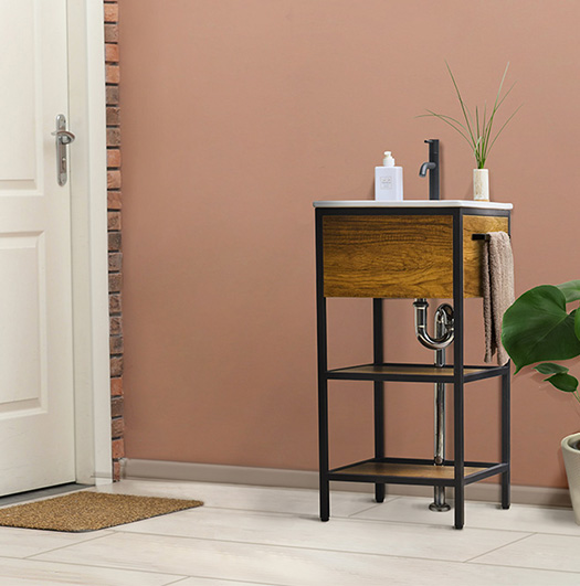水まわりをこだわりたいという方にピッタリの洗面家具です。色合いや質感をとことん追求した木目、メラミン製面材の素材感と黒フレームをマッチングさせたモダンテイストが特徴です。水まわりスペースに存在感を主張しつつも、周りの床材や家具に合わせやすい4色を取り揃えております。