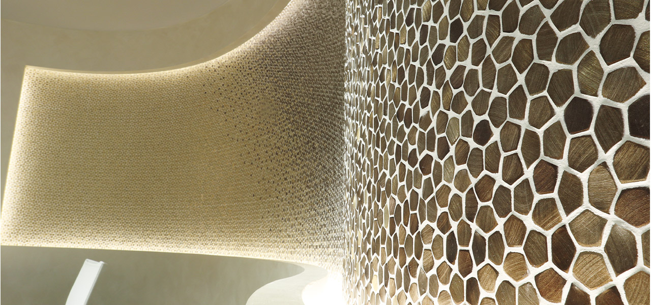 多角形デザインを採用し、表面加工により、つや消しの効果を生み出しつつも、金属的な質感を強調しました。モザイクのひとつひとつにうねりを出すことで、より立体的な仕上がりを実現しました。近未来感のあるデザインを求める商業施設などで使われています。