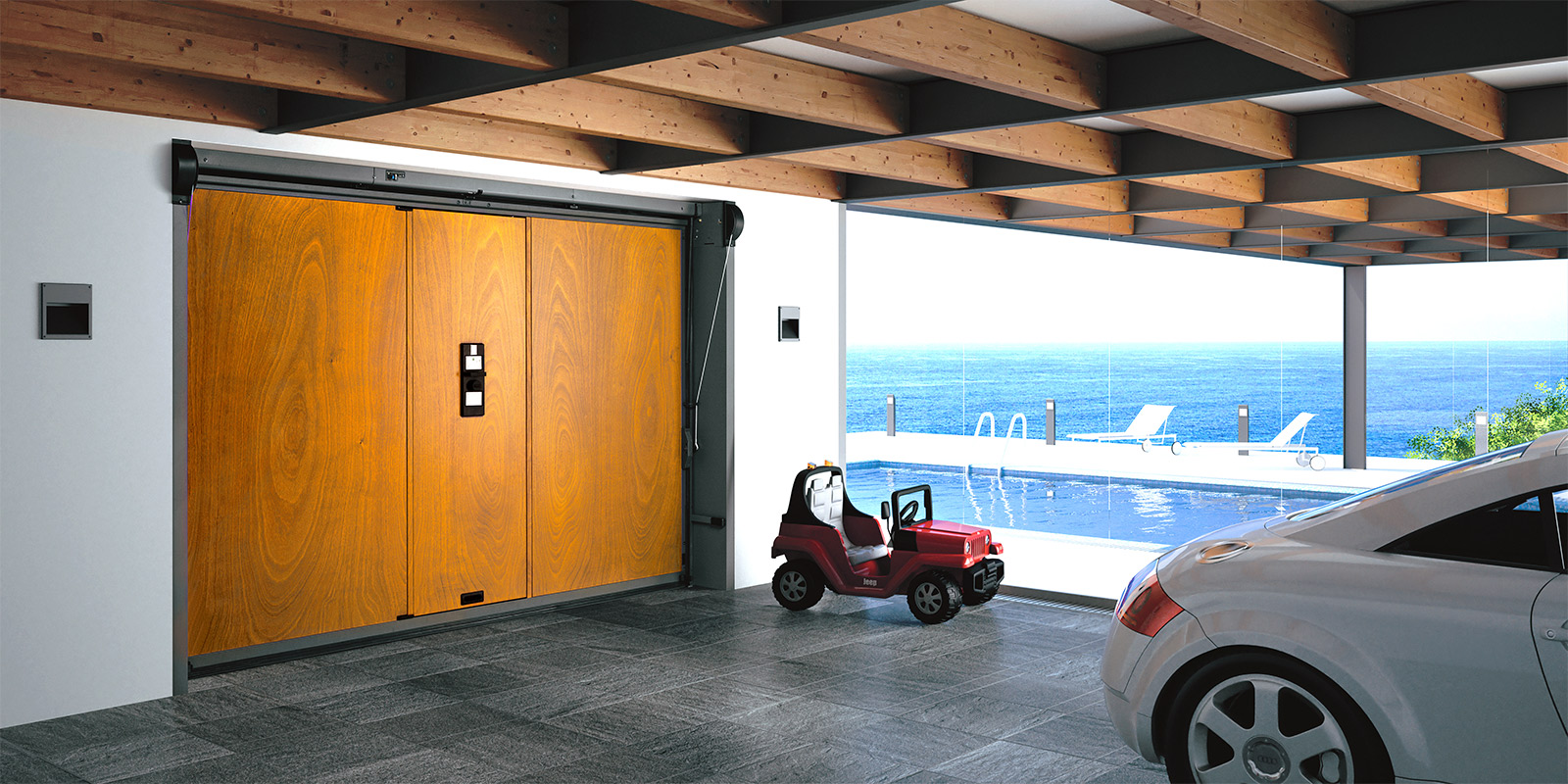 Model VIPは一般的な電動シャッターと比べ2倍以上のスピードで開閉します。リモートコントローラーを標準で装備し、車内でも車外でもボタン一つで開閉。