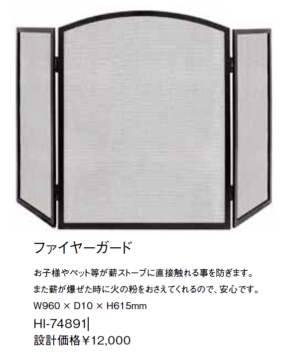 お子様やペットが薪ストーブに直接触れられないようにファイヤーガード(HI-74891)の使用をおすすめします。