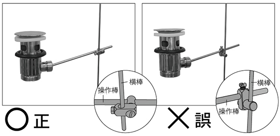 ユニバーサルジョイントは可動式になっており、操作棒用の穴と横棒用の穴があります。正しい方向に取付けると、無理なくスムーズにポップアップを動かすことができます。