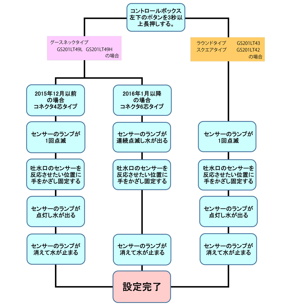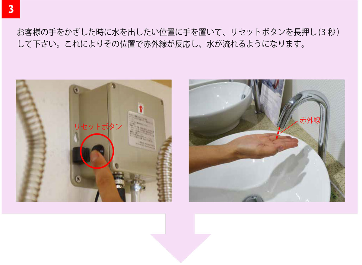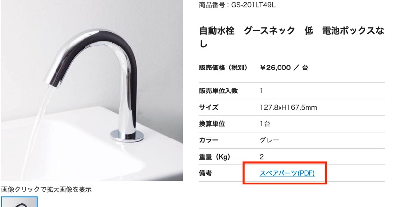※それでも反応が悪い場合は「電磁弁」または「センサー」が交換時期になっている場合が考えられます。ご利用の自動水栓の製品ページの「スペアパーツ」ボタンより分解図と交換方法をご参照の上、これらを購入・交換をお願い致します