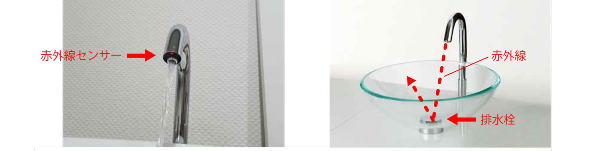 自動水栓の吐水口に赤外線センサーが付いています。この赤外線が排水栓に反射して誤作動している可能性があります。