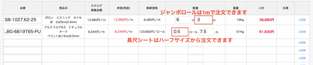 長尺シートのご注文は、WEB注文システムで長尺の品番を入力後、数量欄に必要数を入力してください。