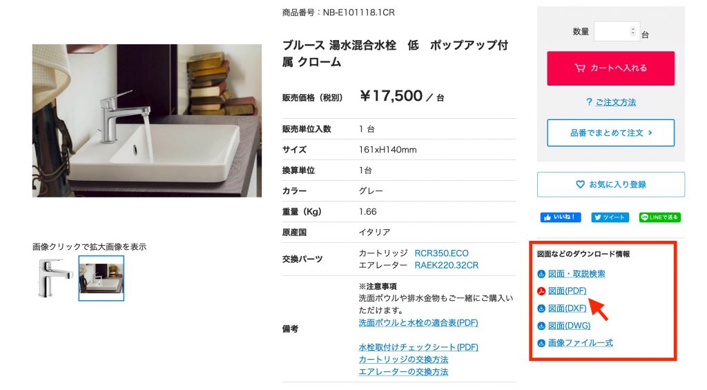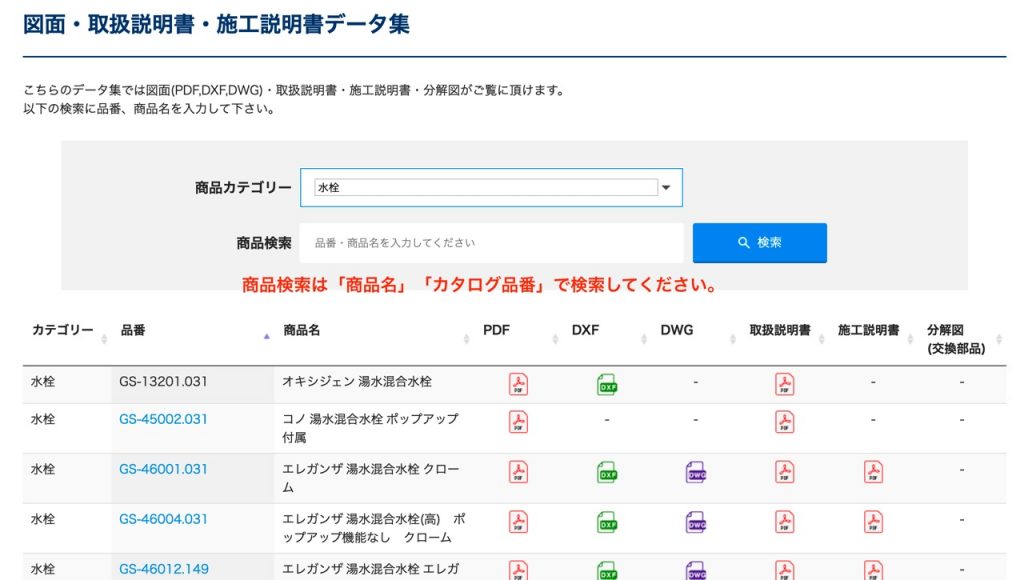各商品ページ(赤枠の部分)からも、図面や取扱説明書など資料をダウンロードできます。