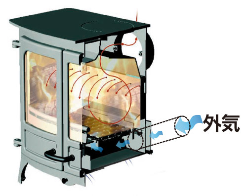 外気を直接本体に導入することにより、安定した状態で薪を燃焼させることができます。