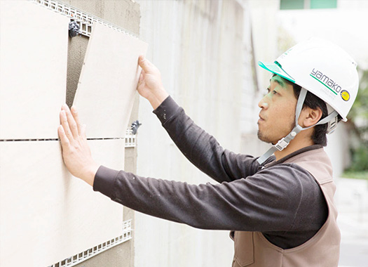 従来では難しかった大型石材・タイルなどの外壁材を安全かつ簡単に施工することが可能に。外壁材をしっかり固定し、地震にも強い工法。